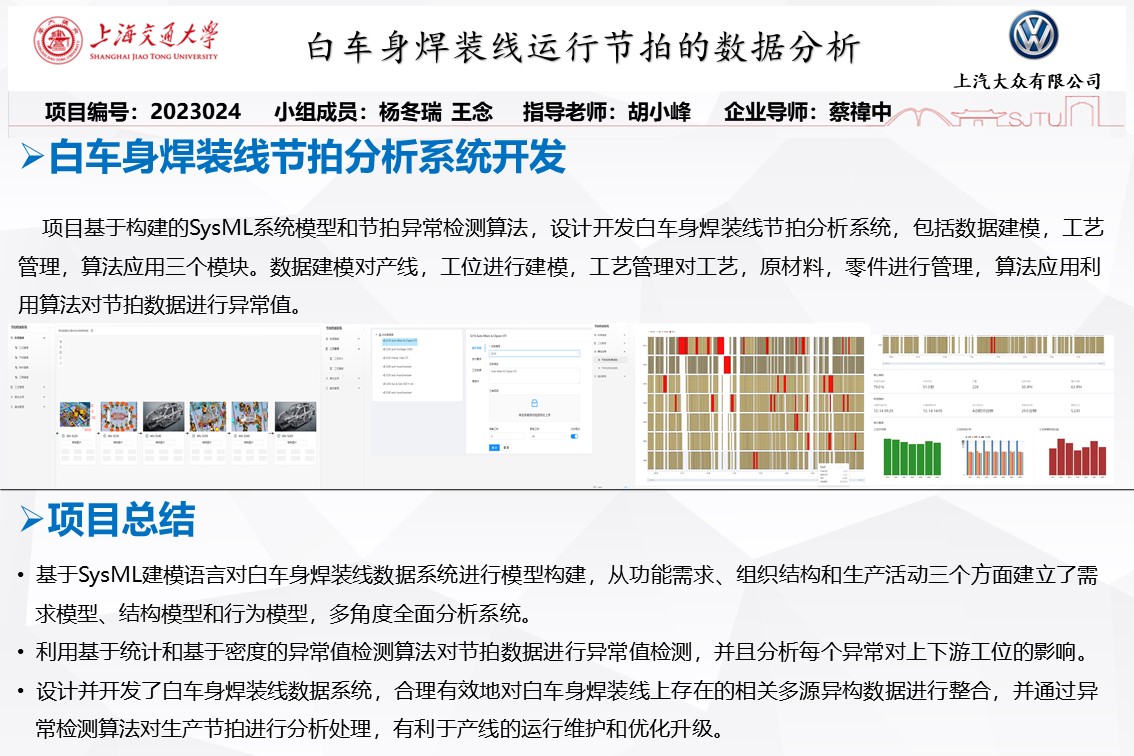 本项目通过对SysML建模方法与异常数据检测算法的研究,设计开发白车身焊装线数据系统,实现对生产节拍信息的合理分析,从而支持生产线运行过程的管理决策。