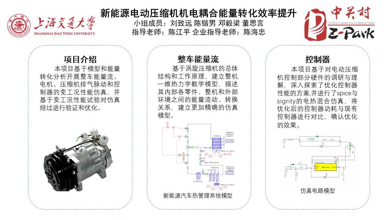 从虚拟仿真和试验验证两个维度开展研究,搭建机电耦合的压缩机整机能量流模型,开展压缩机控制器部件、电机部件、机械部件和排气部件能量转化分析,基于模型和能量转化分析开展控制器、电机、压缩部件的变工况性能仿真,并基于变工况性能试验对仿真经过进行验证和优化;完善压缩机控制策略、电机选型和机械设计,最终实现电动压缩机整机性能提升。