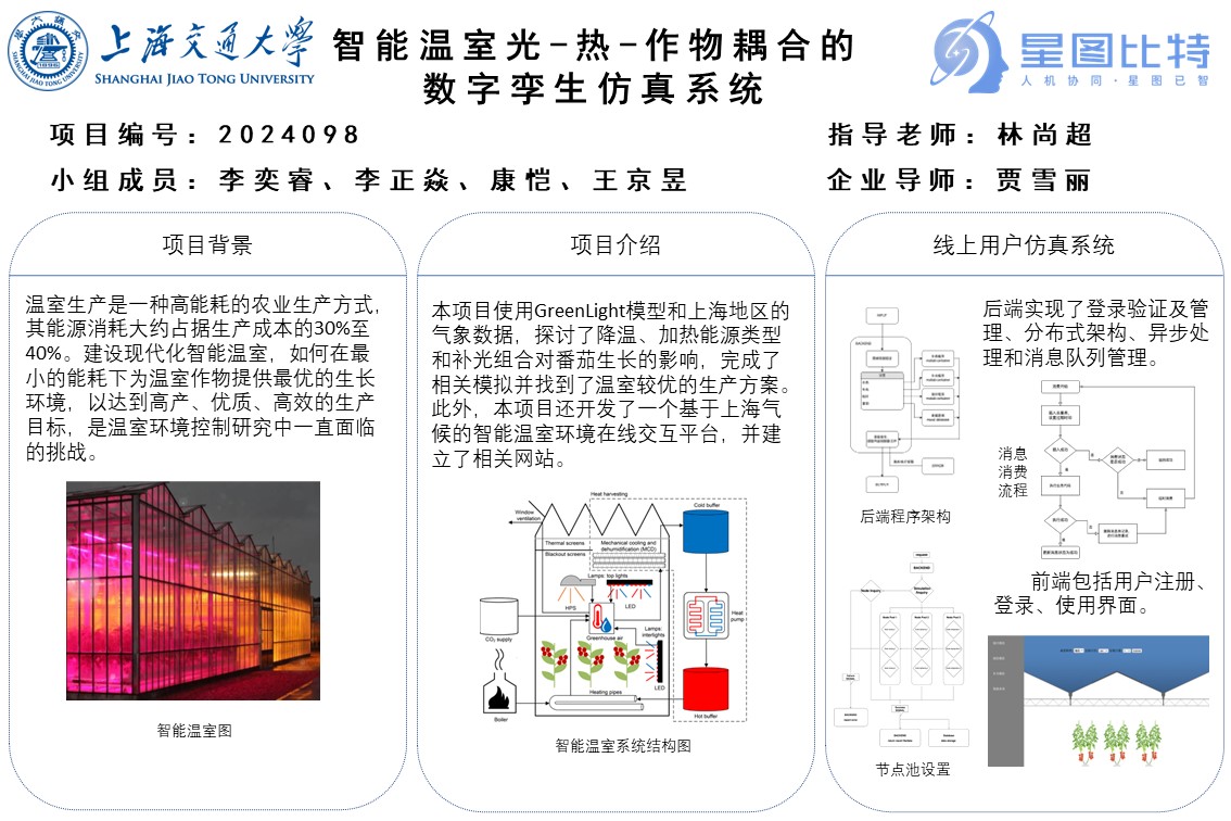 温室是一种高能耗的抗逆性生产设施,一般温室的能耗占温室生产成本的30%~40%。如何以最小的能耗为温室作物提供最佳的生长环境,从而达到高产、优质、高效的温室生产目标一直是温室环境控制研究中所面临的问题。为实现这一目标,本项目建立起根据温室外的气候状况、温室结构以及室内作物信息动态预测温室内状况的数字孪生仿真系统,并根据其优化系统设计。