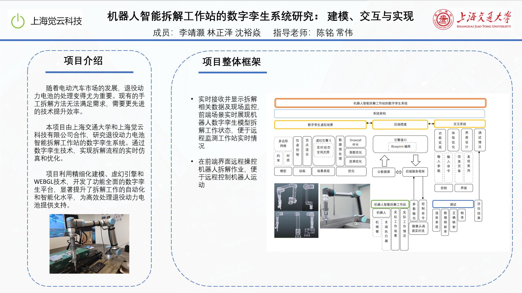 本项目名称为《退役动力电池机器人智能拆解工作站的数字孪生系统研究》,合作单位为beat365中文官方网站和上海觉云科技有限公司。随着电动汽车市场的快速发展,妥善处理退役动力电池对生态环境保护和资源利用具有重要意义。项目通过数字孪生技术,在虚幻引擎(UE)和WEB前端中实现机器人拆解作业的实时仿真还原、实时显示拆解信息以及远程控制机器人,显著提升了拆解过程的效率和稳定性,支持新能源汽车产业的可持续发展。