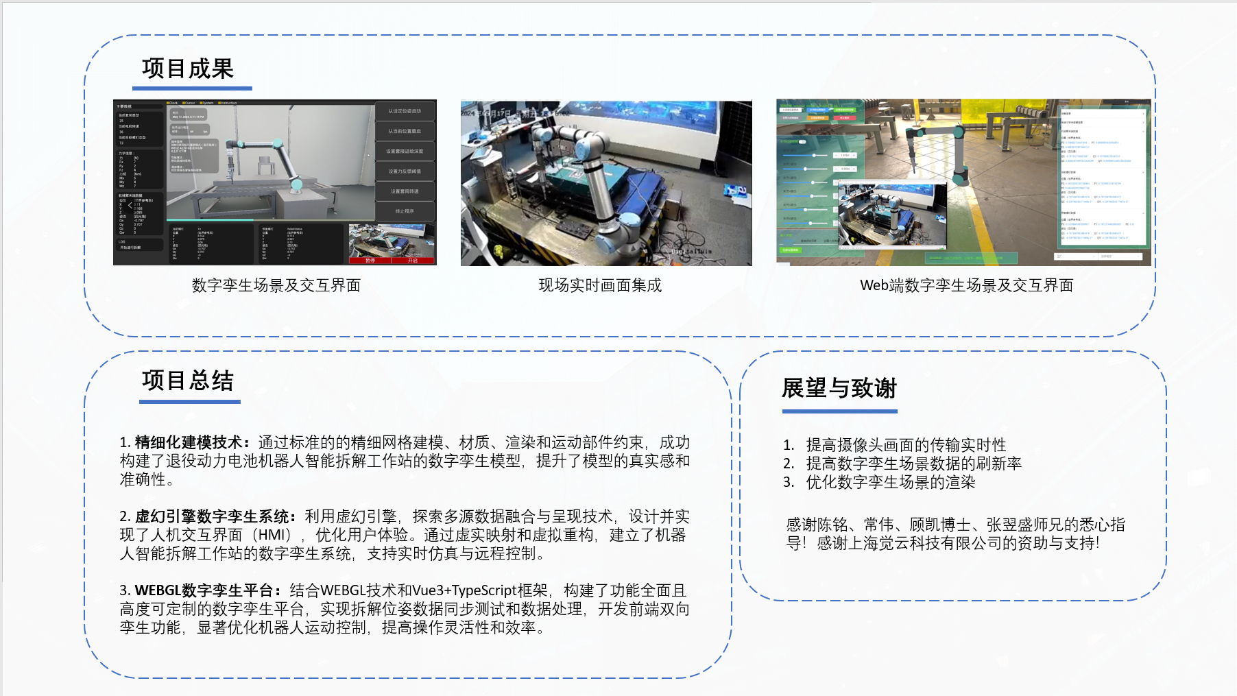 本项目成功开发了基于数字孪生技术的机器人智能拆解工作站,取得了以下成果:构建了高精度的数字孪生模型,真实准确地展现了退役动力电池拆解的场景;开发了基于虚幻引擎的数字孪生系统,实现了多源数据融合、人机交互控制和实时仿真。构建了基于WEBGL技术的高度可定制数字孪生平台,集成了现代前端开发理念和模块化设计,有效优化了机器人运动控制和操作灵活性,显著提升了系统在不同应用场景下的适用性和灵活性。