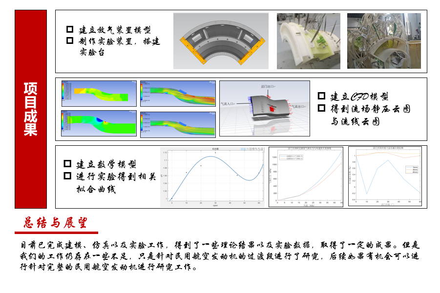 本项目完成了针对可调放气装置国内外研究成果的整理,分析了现有增压级放气装置的特点;成功设计了一个增压级放气装置实验模型,并搭建了实验台;成功构建了CFD计算模型,并通过ANSYS仿真得到了多个工况下增压级的流场变化;成功构建了数学模型,并使用Simulink进行了一维仿真,得到了多个工况下的活门开度与气体参数的相关数据;成功完成了风洞吹风实验,收集了不同开度与气体参数的相关数据,得到了控制规律研究与流场分析的相关实验结论。