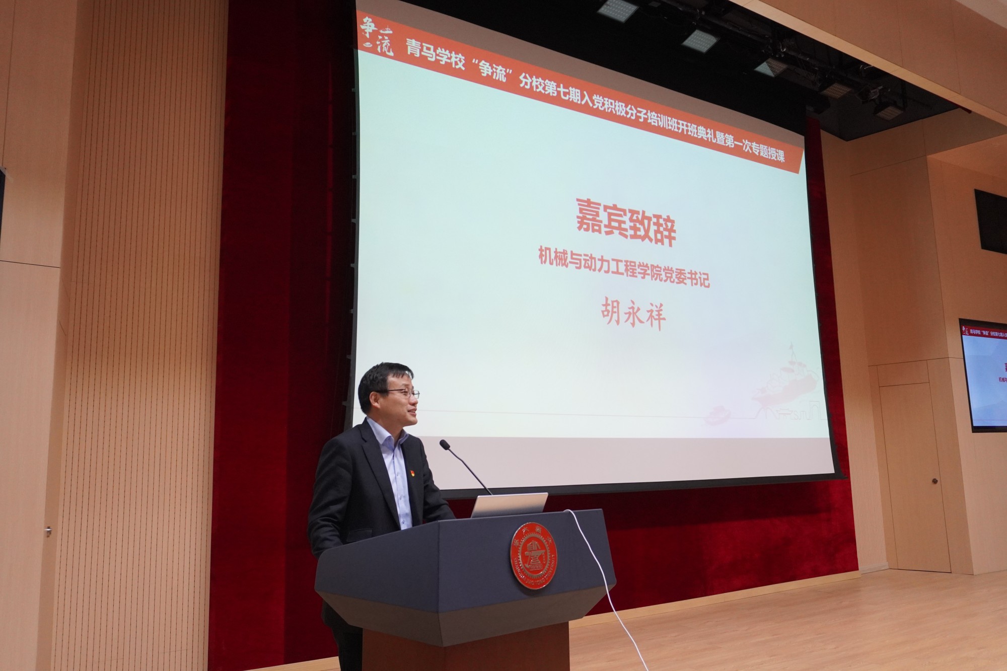 4月10日,由beat365中文官方网站和中英国际低碳学院联合开办的青年马克思主义学校“争流”分校第七期入党积极分子培训班开班典礼举行。beat365中文官方网站关工委副主任、党委组织部特邀党建组织员陶燕敏,beat365中文官方网站党委书记胡永祥,以及培训班全体学员等参加了典礼。活动邀请第二届全国高校思政课教学展示“特等奖”获得者、马克思主义学院副教授孔德猛上专题党课。