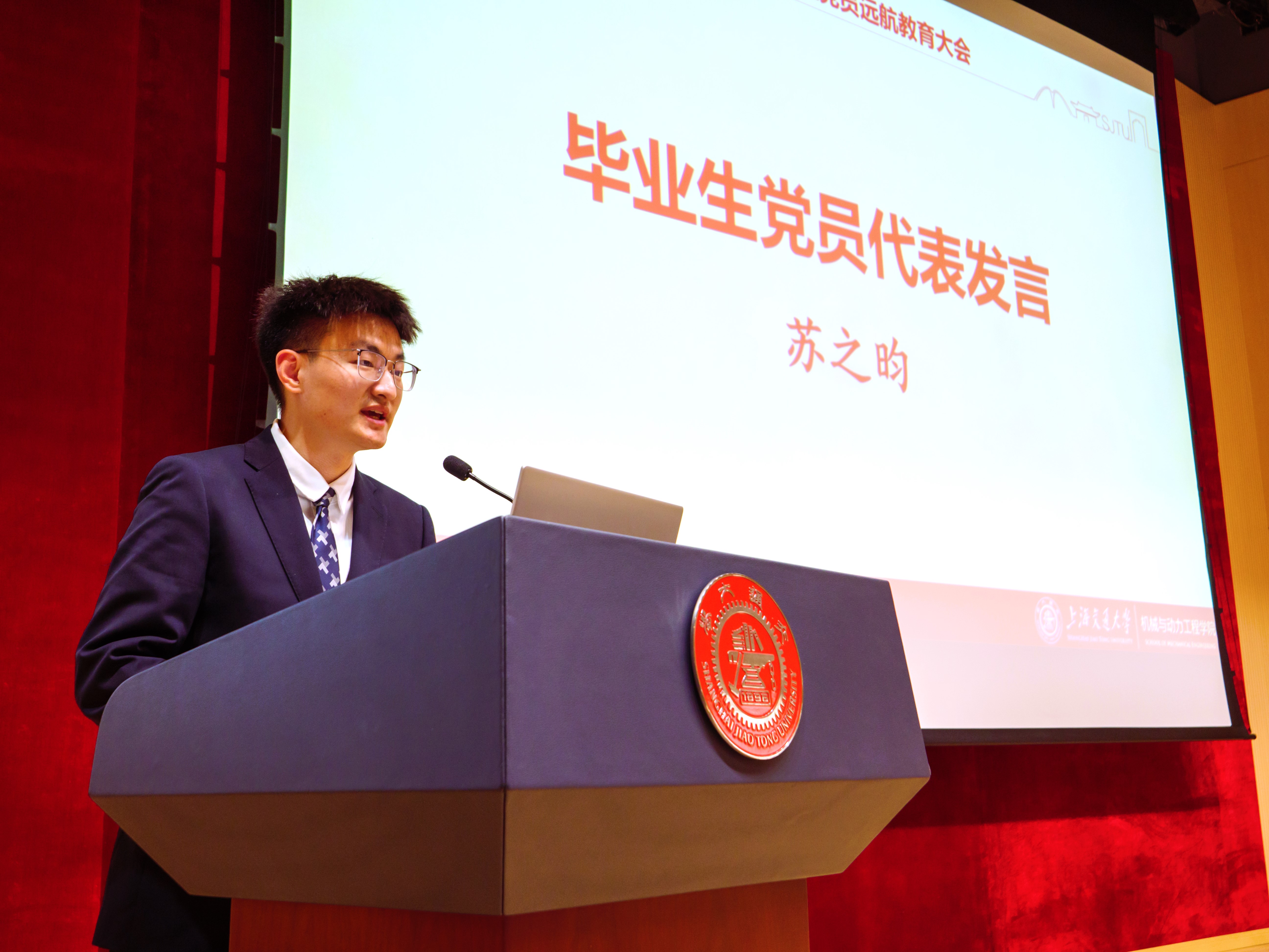 苏之昀作为毕业生党员代表,表达了对母院悉心培养的感恩之情。他结合自身学习科研经历,号召大家多干实事、增长才干,不惧挑战、顽强拼搏,志存高远、敢为人先,传承“饮水思源,爱国荣校”的校训,让青春在奋斗中闪耀光芒,用实际行动书写人生华章。