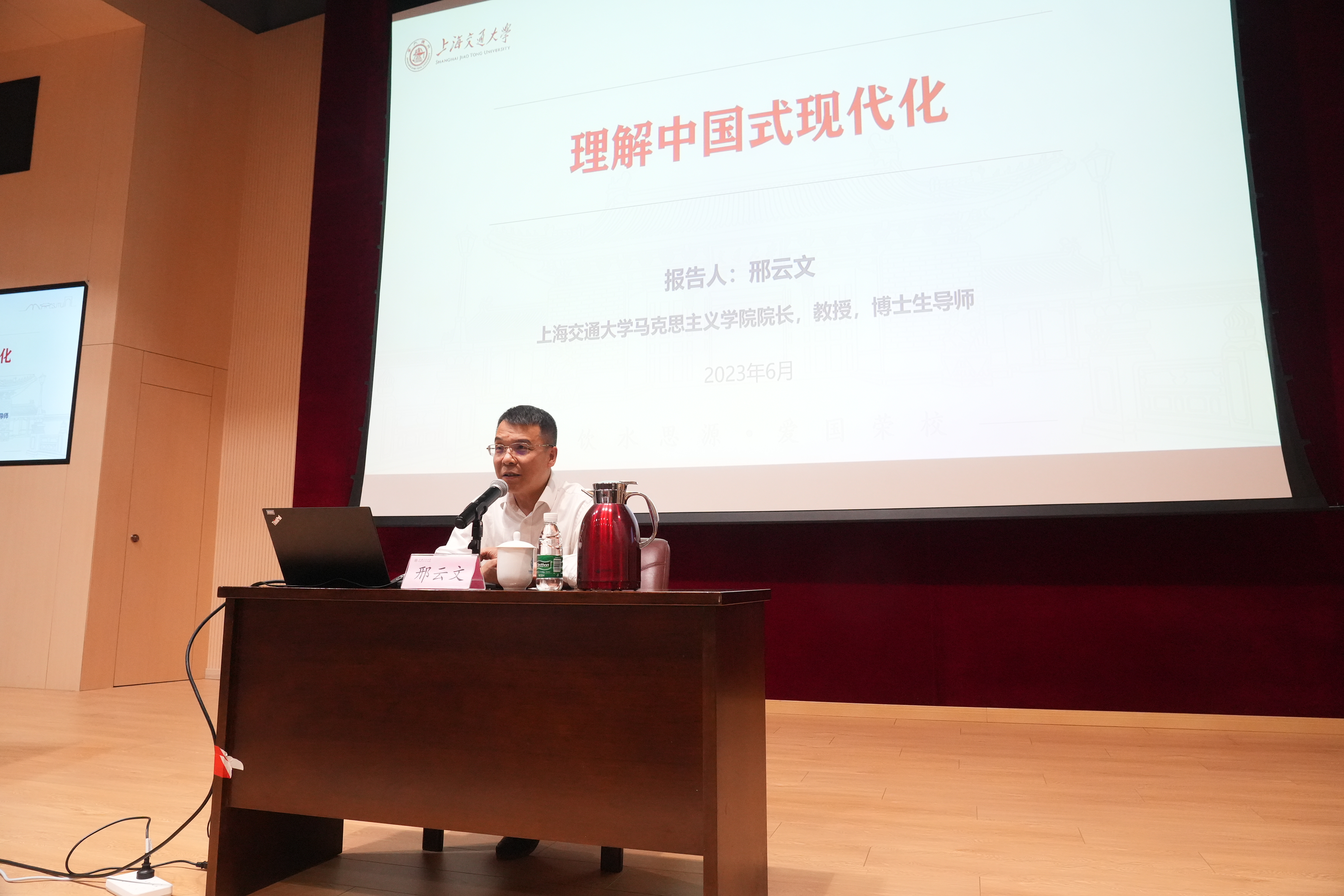 邢云文以“理解中国式现代化”为主题,围绕新时代新征程中国共产党的使命任务、中国式现代化的五个特征,强调中国式现代化是中国共产党领导的社会主义现代化,既有各国现代化的共同特征,更有基于自己国情的中国特色,并结合相关历史进程,从与西方资本主义现代化模式不同、与传统社会主义现代化模式不同、与发展中国家的现代化模式不同的三个方面,深刻阐释了中国式现代化的中国特色。邢云文表示党的二十大报告将教育、科技、人才统筹部署,提升至前所未有的高度,推进中国式现代化,每一个教育工作者需要充分把握高等教育在全面建设社会主义现代化国家中的战略支撑作用,重新思考中国大学的使命,深刻认识中国大学在中国式现代化中发挥的积极作用,在实施创新驱动、人才强国战略,建设中国知识体系,维护国家战略安全等方面贡献力量。