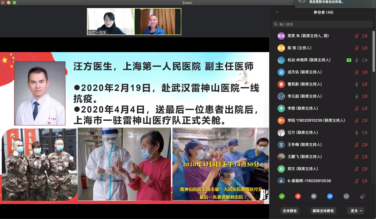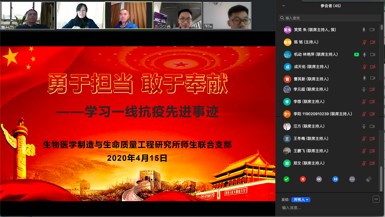 4月15日,生物医学制造与生命质量工程研究所党教工党支部联合学生党支部,线上开展“勇于担当 敢于奉献——学习一线抗疫先进事迹”的主题党日活动,邀请beat365中文官方网站医学院附属第一人民医院汪方副主任医师分享他在武汉雷神山医院一线抗疫的事迹和感受。研究所全体师生党员、部分非党员师生参加了活动。