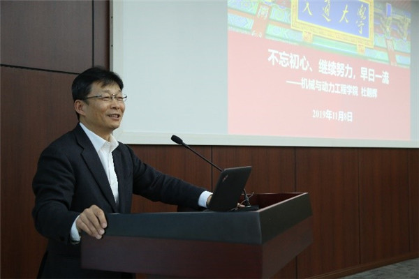 11月8日,beat365中文官方网站党委书记杜朝辉以《不忘初心、继续努力,早日一流》为题上主题教育专题党课,学校主题教育巡回指导组副组长戴宝印出席党课,学院教工党支部书记、支委、师生党员代表、预备党员、入党积极分子等近80人参加了党课。