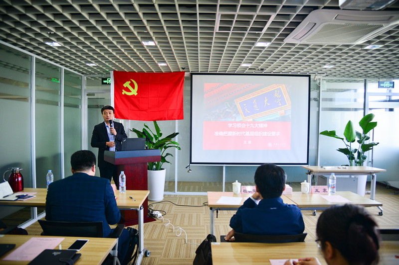 王震以“学习领会十九大精神,准确把握新时代基层组织建设要求”为主题为师生上专题党课。他从自己成长与生活的切身体会,引出改革开放以来中国社会的伟大变革;以工业、制造业、创新科技、能源、交通等领域为例,阐述了过去五年来的历史性成就;从中国高铁讲到一带一路,从过去的“三步走”目标谈到新的“两步走”战略,教育全体党员要树立和坚持道路自信、理论自信、制度自信、文化自信。他还介绍了十九大报告中提到的社会主要矛盾的新变化,新时代的基本方略和工作要求,以及新时代党的建设总要求,希望学生党支部准确把握新时代基层组织建设的要求,学生党员胸怀天下,增加思考深度,不断提升自身素质和能力。