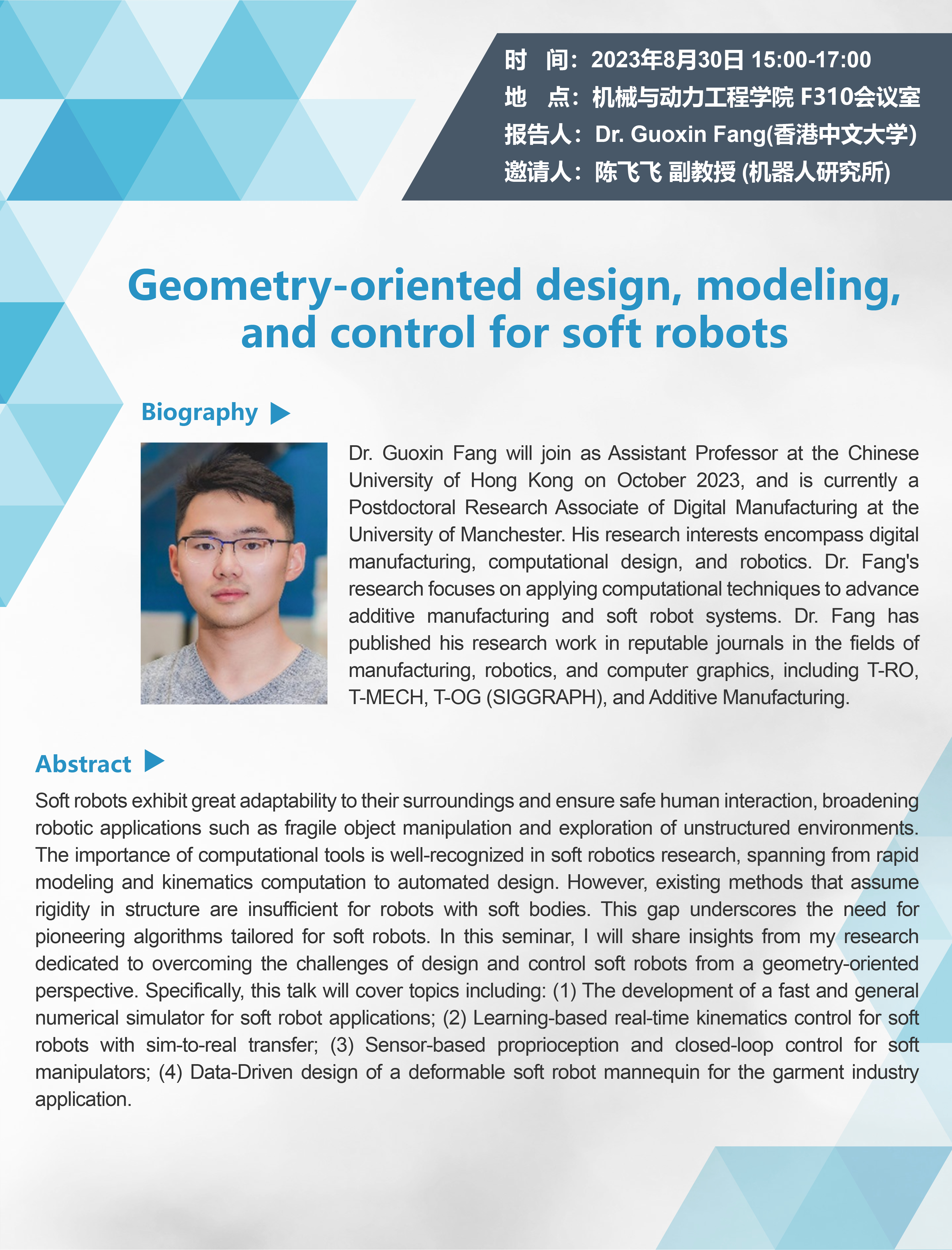 and is currently a Postdoctoral Research Associate of Digital Manufacturing at the University of Manchester. His research interests encompass digital manufacturing, computational design, and robotics. Dr. Fang's research focuses on applying computational techniques to advance additive manufacturing and soft robot systems. Dr. Fang has published his research work in reputable journals in the fields of manufacturing, robotics, and computer graphics, including T-RO, T-MECH, T-OG (SIGGRAPH), and Additive Manufacturing.