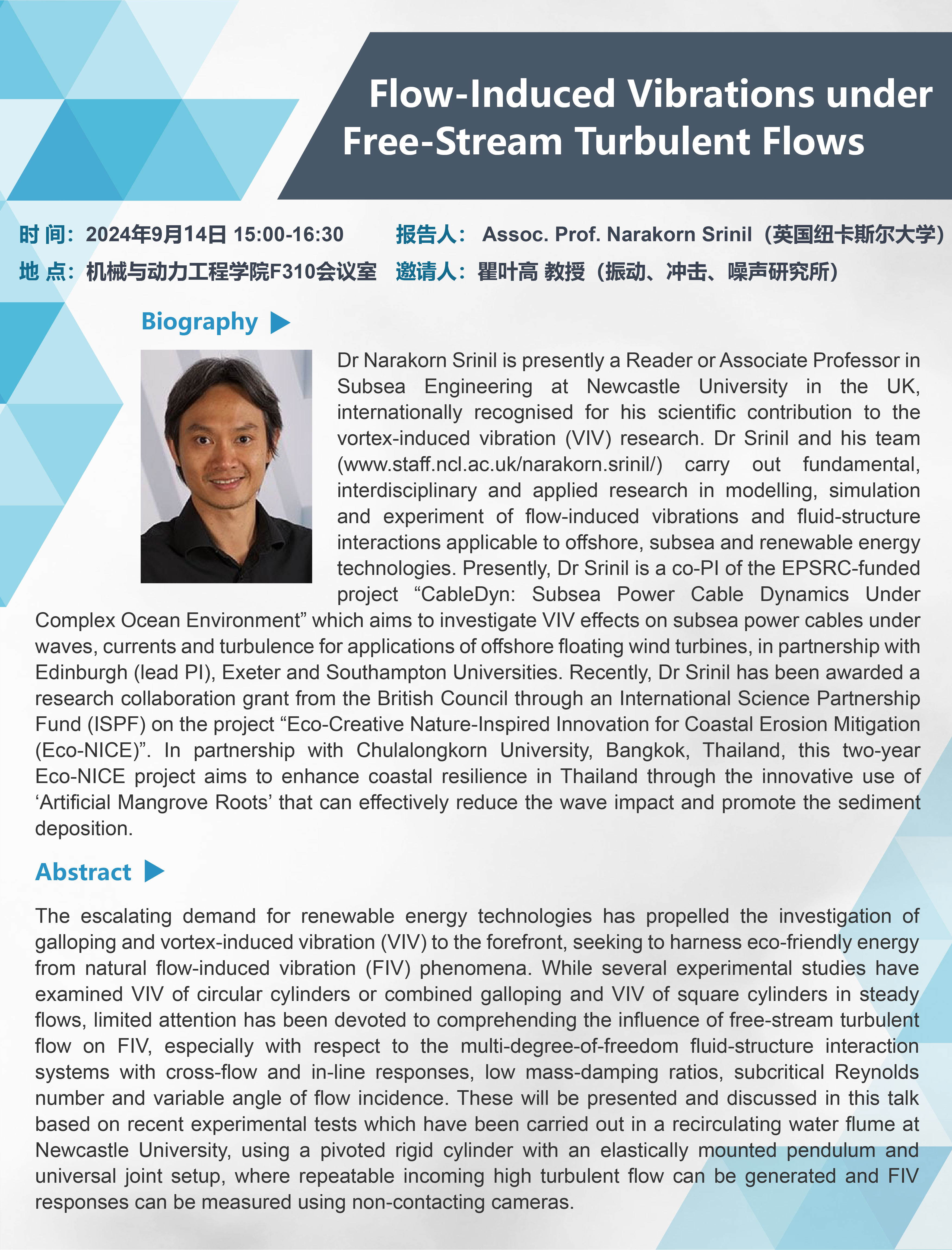 The escalating demand for renewable energy technologies has propelled the investigation of galloping and vortex-induced vibration (VIV) to the forefront, seeking to harness eco-friendly energy from natural flow-induced vibration (FIV) phenomena. While several experimental studies have examined VIV of circular cylinders or combined galloping and VIV of square cylinders in steady flows, limited attention has been devoted to comprehending the influence of free-stream turbulent flow on FIV, especially with respect to the multi-degree-of-freedom fluid-structure interaction systems with cross-flow and in-line responses, low mass-damping ratios, subcritical Reynolds number and variable angle of flow incidence. These will be presented and discussed in this talk based on recent experimental tests which have been carried out in a recirculating water flume at Newcastle University, using a pivoted rigid cylinder with an elastically mounted pendulum and universal joint setup, where repeatable incoming high turbulent flow can be generated and FIV responses can be measured using non-contacting cameras.