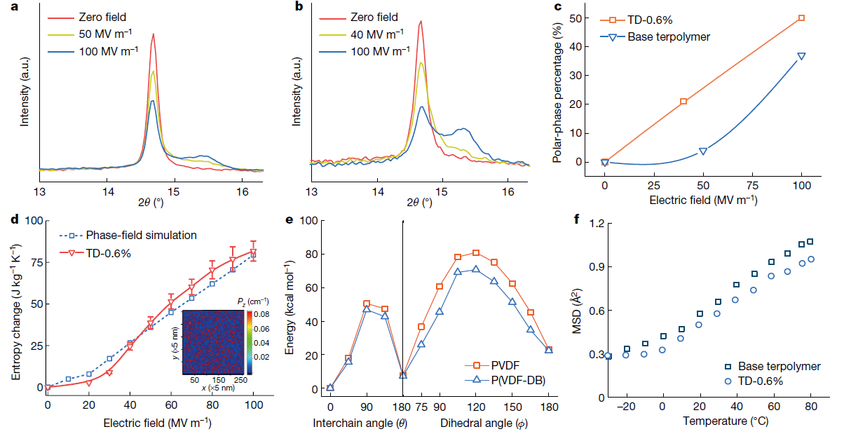 The dielectric properties suggest that the terpolymer modified by reducing a small amount of CFE groups to DBs possesses (i) a much higher dipolar entropy and (ii) much lower barriers for the field-induced transition than that of the base terpolymer, which results in a giant ECE at low electric fields.