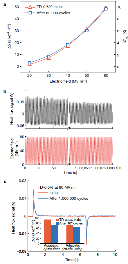 We characterized the fatigue performance of the high-entropy EC polymer under different electric fields and compared it with the base terpolymer under the same cycling conditions. After 61,200 cycles, the ECE of the terpolymer was reduced by 60%. By contrast, the high-entropy EC polymer exhibited less than 10% reduction in the ECE after one million cycles. Under 50 MVm-1, the high-entropy EC polymer films exhibit very little fatigue of EC response.