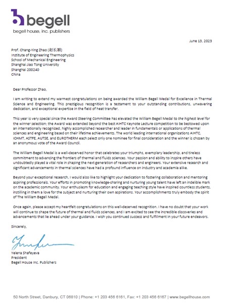 Professor Chang-Ying Zhao, an esteemed faculty member of School of Mechanical Engineering, Shanghai Jiao Tong University, has been awarded the prestigious William Begell Medal for Excellence in Thermal Science and Engineering, for his lifetime achievements and extensive contributions to this field. This distinguished accolade will be presented to Professor Zhao during the 17th International Heat Transfer Conference (IHTC-17) in Cape Town, South Africa.