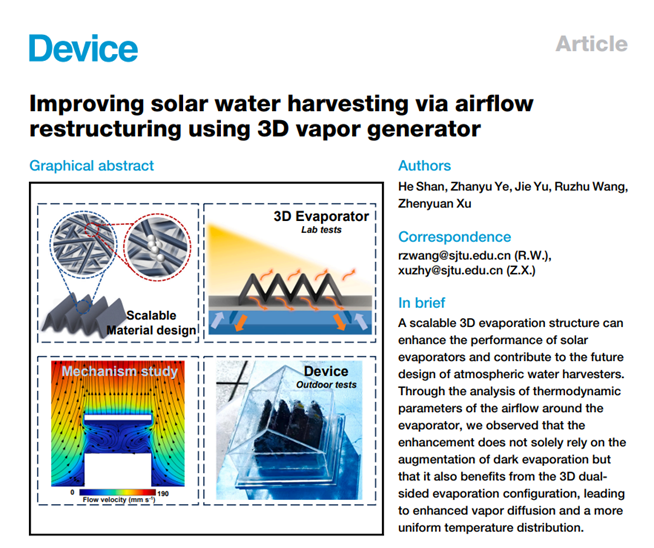 The innovation team ITEWA (Innovation Team for Energy, Water & Air) led by Prof. Ruzhu Wang from School of Mechanical Engineering at Shanghai Jiao Tong University, published a research paper titled "Improving solar water harvesting via airflow restructuring using 3D vapor generator" in the Cell sister journal the Device. The paper analyzed the enhancement in the evaporation rate and efficiency of 3D origami-type evaporators under laboratory and outdoor conditions, which helps the understanding and future design of solar evaporator and atmospheric water harvester.