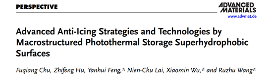 The innovation team ITEWA (Innovation Team for Energy, Water & Air) led by Prof. Ruzhu Wang from School of Mechanical Engineering at Shanghai Jiao Tong University, in collaboration with University of Science and Technology Beijing and Tsinghua University, published an article titled "Advanced Anti-Icing Strategies and Technologies by Macrostructured Photothermal Storage Superhydrophobic Surfaces" in Advanced Materials. Prof. Fuqiang Chu from University of Science and Technology Beijing and Dr. Zhifeng Hu from Shanghai Jiao Tong University are co-first authors of the paper. Prof. Yanhui Feng from University of Science and Technology Beijing, Prof. Xiaomin Wu from Tsinghua University, and Prof. Ruzhu Wang from Shanghai Jiao Tong University are corresponding authors.