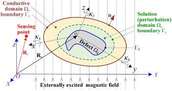 In this paper, a 3-dimensional simulation model applicable to eddy current (EC) defect detection, which is implemented based on continuous mechanical scanning, was established using a distributed current source (DCS) method. In the model, the perturbed EC field was formulated in state space and then iteratively solved to predict the transient response of an EC testing system. With a reduced solution domain, both computational efficiency and accuracy were improved. Based on the DCS model, parametric effects of the sensing positions/directions, excitation frequencies, and scanning speeds on the detection results of cavity defects were analyzed, which led to the development of an EC probe consisting of a pair of rectangular electromagnets and a magnetic field sensor, and the estimation of the scanning speed limits for fine and coarse detection. Besides, several methods to address the implementation issues possibly encountered in practical applications have also been presented. This research aims to improve the detection efficiency in the traditional point-by-point EC testing method. This work was supported in part by the National Natural Science Foundation of China.