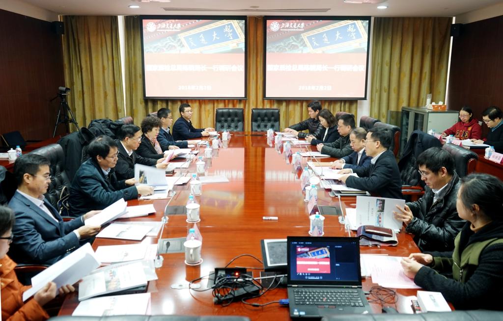 2018年2月2日下午,国家质检总局副局长陈钢、办公厅副主任俞晓丹、质量司副司长王赟松、科技司副司长周举文、发展研究中心副主任姚雷一行6人到上海交大调研。校长、党委副书记林忠钦院士,副校长奚立峰,上海市质监局副局长沈伟民等出席调研活动。