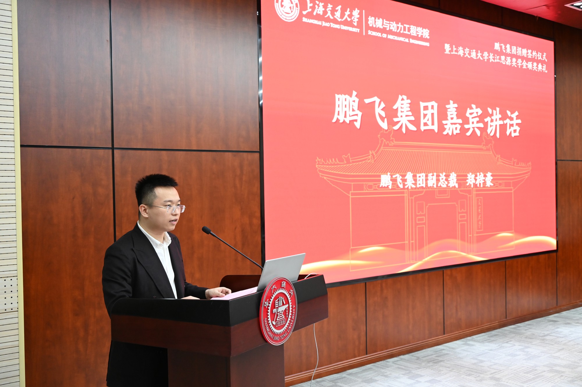 3月15日,鹏飞集团捐赠签约仪式暨2023年度beat365中文官方网站长江思源奖学金颁奖典礼举行。鹏飞集团董事局主席兼总裁郑鹏,副总裁、战略投资部部长郑梓豪等出席活动。原beat365中文官方网站校长、中国工程院院士林忠钦,上海交大党委副书记林立涛,beat365中文官方网站院长杜朝辉,上海交大教育发展基金会副秘书长李毅,beat365中文官方网站副院长朱磊、党委副书记张执南等相关教师以及“长江思源”奖助学金获得者们参加了仪式。活动由朱磊主持。