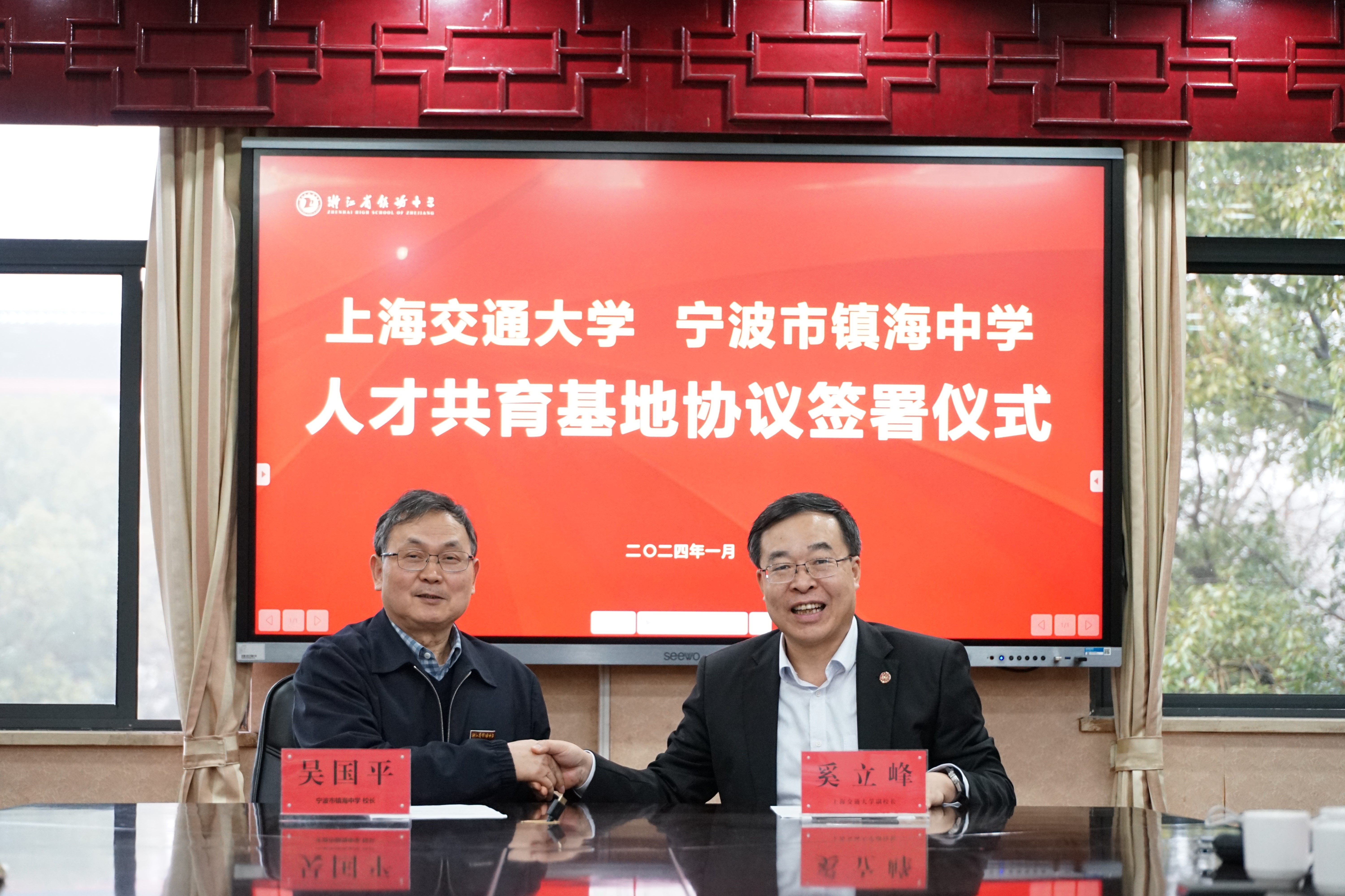1月19日下午,beat365中文官方网站与浙江省宁波市镇海中学人才共育基地协议签署仪式在镇海中学举行,上海交大副校长奚立峰和镇海中学校长吴国平分别代表两校签约。