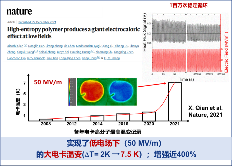 目前最优电卡材料(包含有机、无机材料)都需要极高电场(E>108 V/m)方能触发可用的制冷效应(DT> 5 K),电介质在高电场下存在电学疲劳甚至击穿。因此,更好的电卡制冷固态材料需要(1)更高的电卡效应;(2)更低的驱动电场;(3)更长的循环寿命。