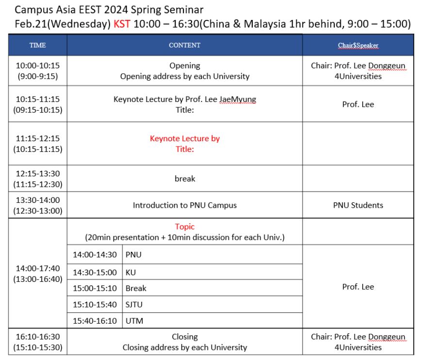 2024亚洲校园春季研讨会将于2月21日在线举办,为期一天。此次由韩国釜山国立大学主办,beat365中文官方网站协办,议程安排如下: