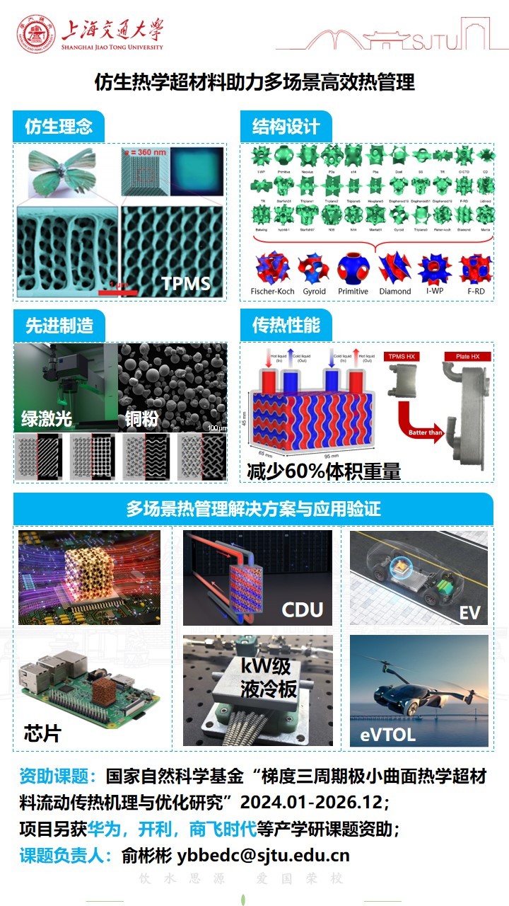1. Zhang fengrui, ..., Binbin Yu*. Nature-inspired gradient triply periodic minimal surface cold plate: Coral wave structural design for enhancing electronics cooling. International Journal of Heat and Mass Transfer, 2026, 128252.