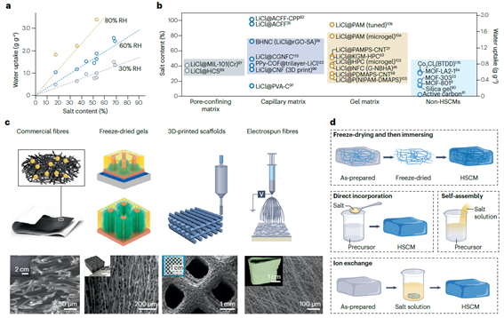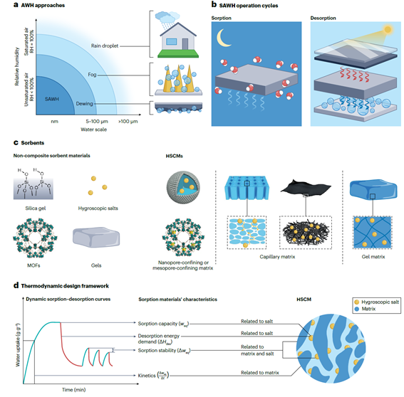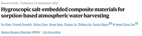 近日,beat365中文官方网站王如竹ITEWA创新团队在Nature Reviews Materials上发表题为“Hygroscopic salt-embedded composite materials for sorption-based atmospheric water harvesting”的综述论文,从热力学角度分析了用于空气取水的吸湿盐掺杂复合吸附剂中吸湿性盐、水和盐溶液之间的相互作用关系,建立了吸湿盐类型与含量、孔隙结构和基质承载能力等结构参数与最终材料性能之间的联系,总结性地提出了指导吸附剂吸附量、解吸焓、动力学和稳定性的理论设计框架,为空气取水及相关领域中吸附材料的设计提供统一验证与调控新方法。beat365中文官方网站-新加坡国立大学联授学位博士生山訸为论文第一作者,王如竹教授、新加坡国立大学陈瑞深副教授为通讯作者。