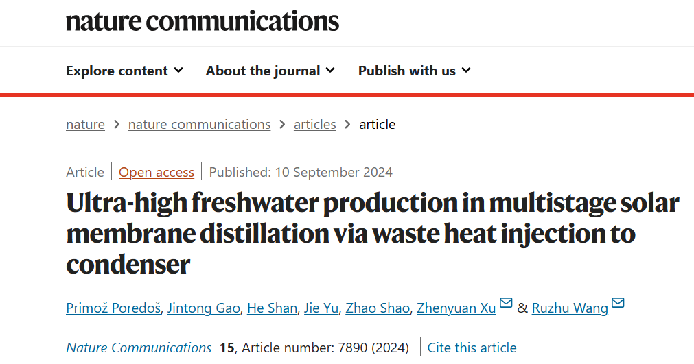 近日,制冷与低温工程研究所“能源-水-空气”交叉学科创新团队ITEWA在Nature Communications上发表了题为“Ultra-high freshwater production in multistage solar membrane distillation via waste heat injection to condenser”的研究论文,提出了基于热增压强化的多级太阳能膜蒸馏策略,通过在蒸馏装置末端利用低温热源进行加热,从而提升系统整体的运行温度和蒸发-冷凝蒸汽压差,实现更高的蒸汽通量。本文的第一作者为博士后Primož Poredoš、高金彤和博士生山訸,王如竹教授和徐震原教授为通讯作者。