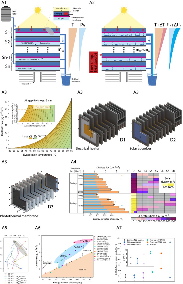 本文提出了一种新型的多级太阳能膜蒸馏系统,与现有技术(图A1)在系统末端只考虑冷却的思路不同,新系统在末端利用低温热源进行加热,从而提升系统整体的运行温度和蒸发-冷凝蒸汽压差(图A2),作者将其称为温度增压(Stage temperature boosting,STB)方法。该做法实现了意想不到的提升效果,尤其在装置整体产水量方面的提升非常明显。