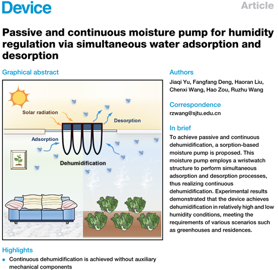 近日,beat365中文官方网站制冷与低温工程研究所王如竹教授团队在Cell姊妹刊Device上发表了题为“Passive and continuous moisture pump for humidity regulation via simultaneous water adsorption and desorption”的研究论文,针对多场景除湿需求,提出了一种基于同时吸附和解吸的被动连续式湿泵。该装置采用吸湿盐溶液浸渍多孔基质制备复合吸附材料,通过手表形结构设计,在空间上实现了吸附材料内吸附与解吸过程的并存,从而实现连续除湿过程。研究突破了传统连续式除湿技术需依赖外部主动能源的限制,为未来湿度控制技术的设计提供新思路。制冷与低温工程研究所博士生余佳琦是本文第一作者,王如竹教授为通讯作者。