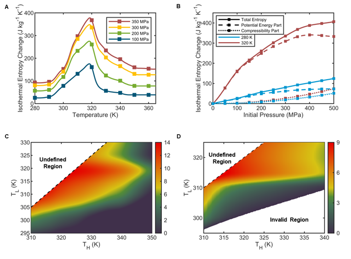 论文通过分子动力学仿真对新戊二醇固态相变的热力学参数及理论冷却循环的效能系数进行计算。在压强驱动下(350 MPa变换之0.1 MPa),新戊二醇在大约320 K的条件下,可实现最高380 J kg−1 K−1的理论等温熵变和42 K的理论绝热温变,其中构型熵达到345 J kg−1 K−1,占到总熵变的约90%。在5 K的温度跨度条件下,逆向斯特林冷却循环和逆向布雷顿冷却循环的理论效能系数最大可达到14和7.5。本研究首次提出了塑料晶体的大规模使用场景中的压卡冷却效应,对未来新型清洁绿色固态制冷技术的大规模应用具有重要的技术价值。