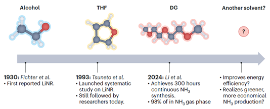 使用DG溶剂还可降低电解液电阻,提升合成氨过程中的能量效率。章俊良课题组在先前的研究中发现,锂介导合成氨反应中使用DG电解液,离子的溶剂化效应更显著,DG分子的空间位阻效应将有效避免离子的聚集,进而增强电解液导电性。课题组在本文中回顾了锂介导合成氨发展历程中的重要技术突破及时间节点,发现上述关键突破都与溶剂创新关联密切,并进一步展望了未来锂介导合成氨反应的发展方向,指出溶剂将继续发挥关键作用。