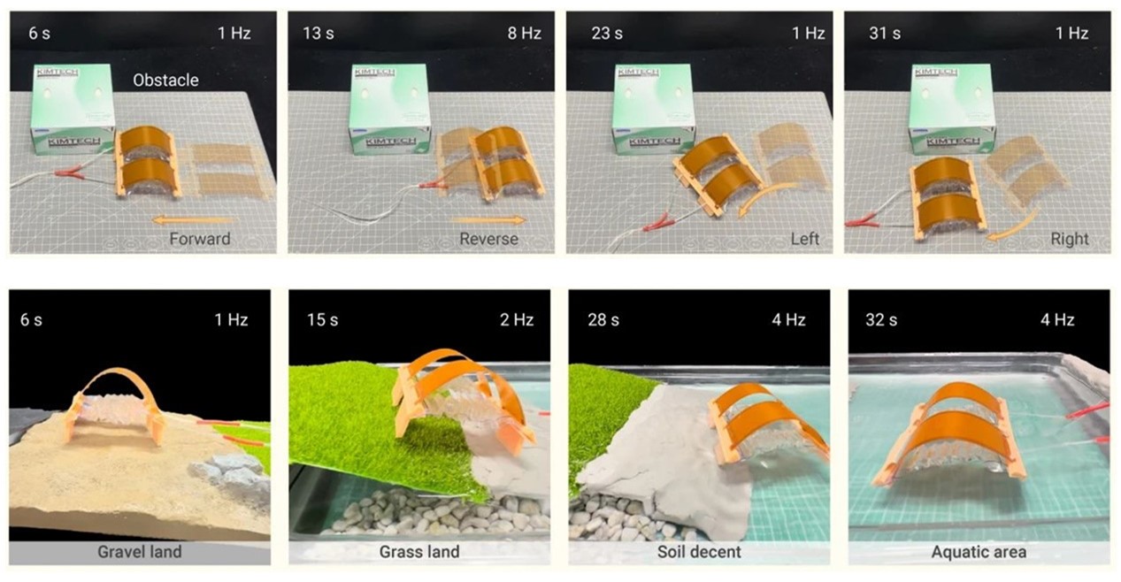 环境适应性是软体机器人实现高效运动的重要特征。然而,现有软体机器人的感知系统与驱动系统相对独立,存在本征的感驱信息误差,使得两者协同控制效果受限。设计和开发一种像生物体一样具有独立决策和自发调节能力的智能软体机器人仍颇具挑战。针对上述问题,课题组仿照生物体运动器官—脊椎和软组织肌肉,利用压电效应的可逆性,设计了感驱一体的仿生脊椎,利用气动折纸驱动器作为人工肌肉,实现了一种具有自我感知适应能力的智能软体机器人。该仿生脊椎利用可逆的物理效应,能够为软体机器人提供躯干支撑、驱动辅助和感知调节等功能。