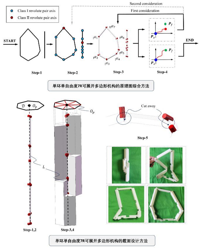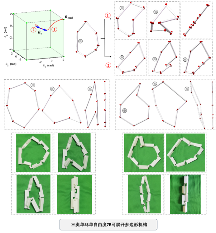 针对获得理论机构解的原理图综合子问题,研究团队讨论了构建DGM过程中的两类转动副轴线布局及其取值范围,并定义了构建DGM的三类参数。为了设计出具有任意期望的可展开多边形形态的单环单自由度DGM,该团队首次提出利用DGM的不同状态完成不同种类参数的设计,给出了每类参数设计过程中所需要的全部约束条件及其几何含义,并使用预测校正方法实现了在隐式定义的构型空间中的路径搜索问题,从而形成能够设计所有单环单自由度7R DGM的原理图综合方法。团队提出的利用DGM不同状态完成不同种类参数设计的设想,能够拓展至其他类型DGM的原理图设计。