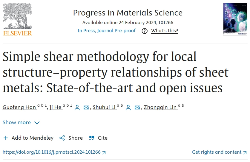 近日,beat365中文官方网站薄板结构制造研究所林忠钦院士课题组在国际材料领域期刊Progress in Materials Science上发表了题为“Simple shear methodology for local structure–property relationships of sheet metals: State-of-the-art and open issues”的综述论文。论文总结了金属薄板简单剪切测试方法的理论基础、实验技术以及其在揭示材料结构-性能关系中的应用现状,进一步指出了目前存在问题和潜在解决方案。薄板结构制造研究所何霁副教授和李淑慧教授为论文共同通讯作者,博士生韩国丰和何霁副教授为论文共同第一作者。