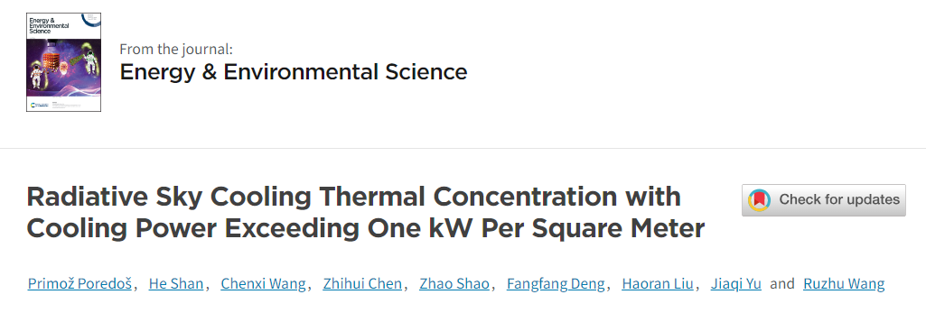 近日,beat365中文官方网站王如竹教授领衔的ITEWA多学科交叉创新团队在Energy & Environmental Science上发表了题为Radiative Sky Cooling Thermal Concentration with Cooling Power Exceeding One kW Per Square Meter的论文,提出辐射制冷热集中策略,实现制冷功率超过千瓦每平米。论文第一作者是制冷与低温工程研究所博士后Primož Poredoš,通讯作者是王如竹教授。