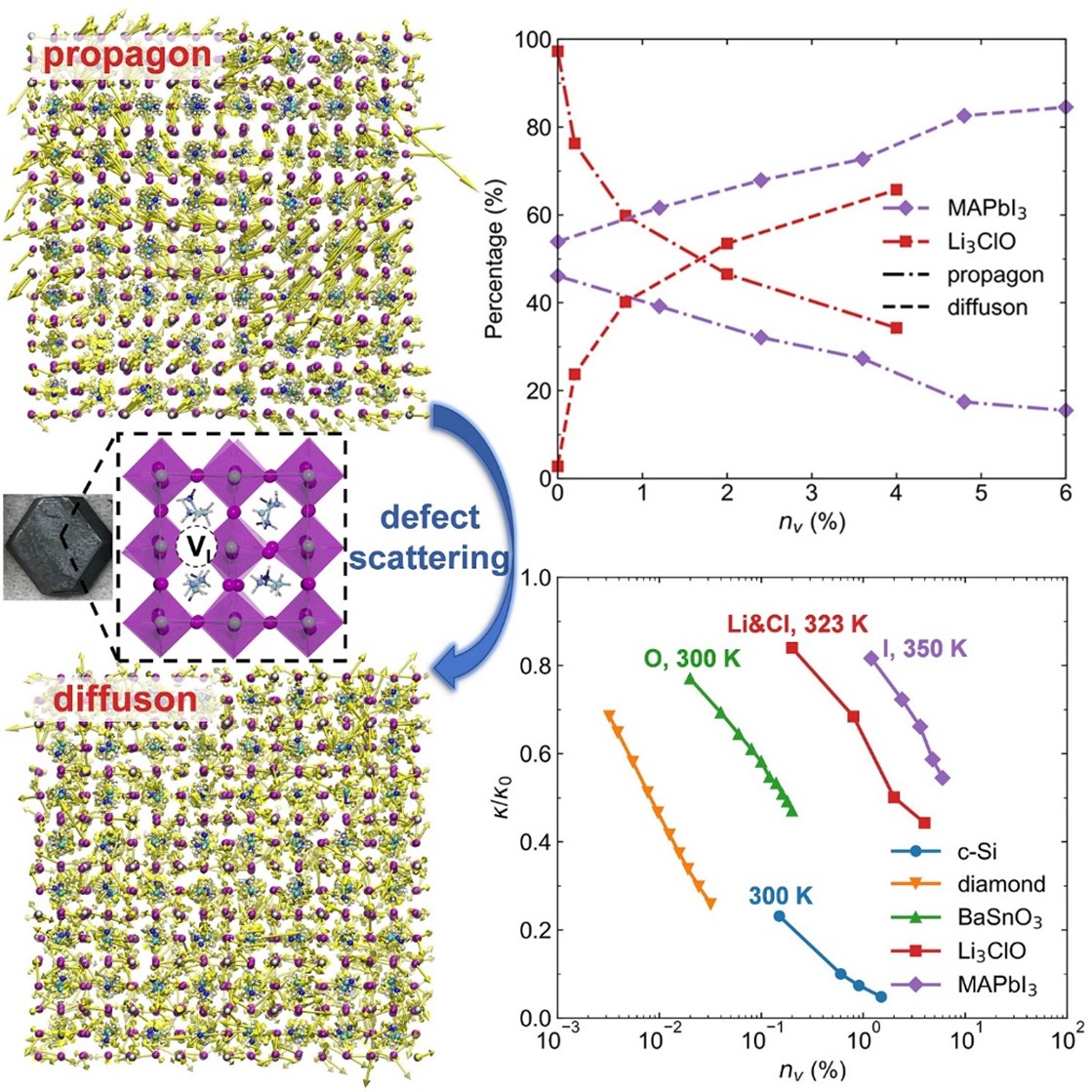 有机无机杂化钙钛矿,如甲胺碘化铅CH3NH3PbI3(MAPbI3),作为太阳能电池的光吸收层、LED的光发射器、热电器件和忆阻器的关键材料,极大地吸引了学者们的关注。杂化钙钛矿的热输运对于这些器件的热管理起着关键作用,同时也影响了其他能量载流子,如激子、极化子、电子和空穴等。随着对这类包含无序结构的材料热传导机制的深入研究,发现微观热传导的理论基石——声子气体热输运理论——不再适用。包含无序结构的材料内临近振动模态的相互干涉,引发了各类新奇的热传导现象,如包含了传播子(propagon)、扩散子(diffuson)和局域子(locon)的多通道热载能子现象,为热传导研究提供了新的理论范式。在MAPbI3的高温相中,由于旋转的MA+离子和碘离子无序性,热输运兼具传播子(类似于传统声子)和扩散子的特点。在杂化钙钛矿的生长过程中,点缺陷的出现不可避免。对于MAPbI3,主要的点缺陷是碘离子和MA+离子的空位和间隙缺陷。但目前对于带有点缺陷杂化钙钛矿的热输运研究却很少。另外,尽管点缺陷对于晶体中声子热输运的影响已经得到充分的研究,但其对扩散子通道的热输运影响还未深入探索。