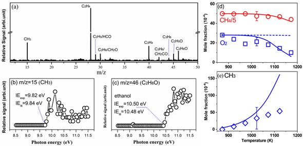 图2 (a)光电离质谱;(b)甲基自由基与乙醇的光电离效率谱;(c)反应物甲烷与氧气的实验与模拟结果对比;(d)甲基自由基的实验与模拟结果对比