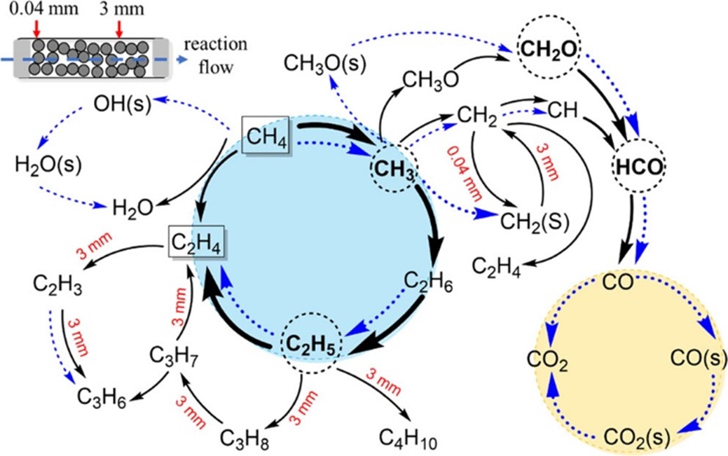 甲烷作为重要的C1分子,其清洁、高效转化利用研究已得到了持续且广泛的关注。OCM被广泛认为是将甲烷直接转化为C2产物(如乙烷和乙烯)的最有前途的方法之一(图1)。OCM反应的热效应会显著影响产物的形成和分布,局部过热会加剧深度氧化,进而降低C2产率。深入理解OCM复杂的气-固两相反应机理并发展微观反应动力学模型,将为催化剂、反应器的设计以及工业操作条件的优化提供理论指导。