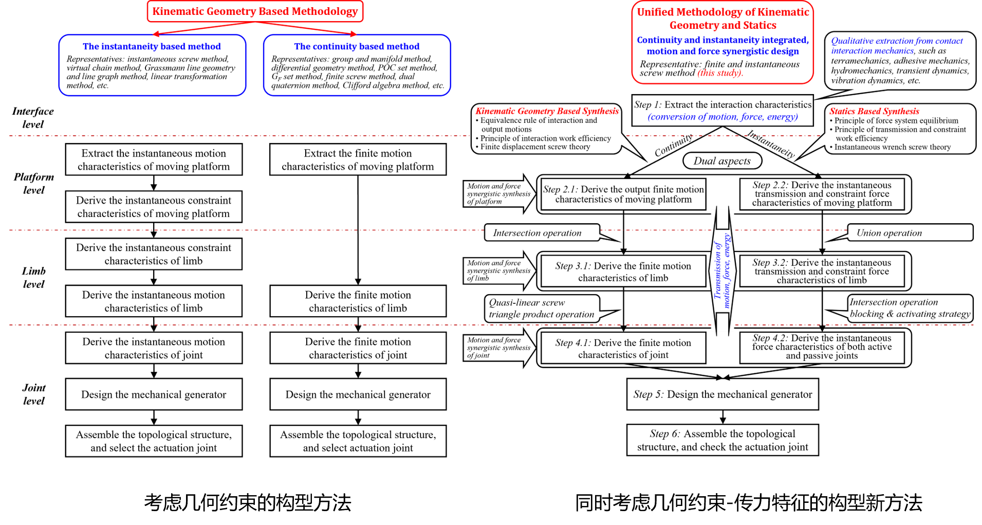 近日,beat365中文官方网站beat365中文官方网站重大装备设计与控制工程研究所郭为忠教授团队在Mechanism and Machine Theory上发表了题为“Updating structural synthesis methodology of mechanisms: from kinematic geometry to kinematic geometry accompanied with statics”的研究论文。该团队突破了目前国际上机构拓扑综合理论方法仅考虑运动几何约束的局限,首次在机构构型设计中引入力流传递特征,系统建立了同时考虑几何约束和传力特征的机构拓扑综合新方法,更适合考虑机-环境存在力交互作用的现代机械装备创新设计的需要。重大装备设计与控制工程研究所博士研究生韩有承为论文第一作者,郭为忠教授为通讯作者。