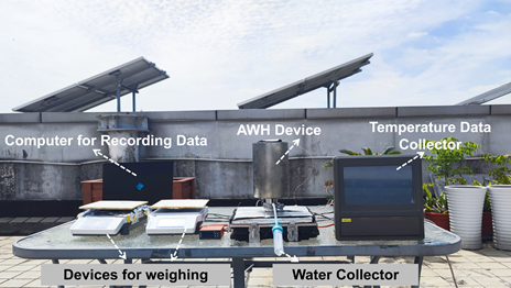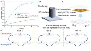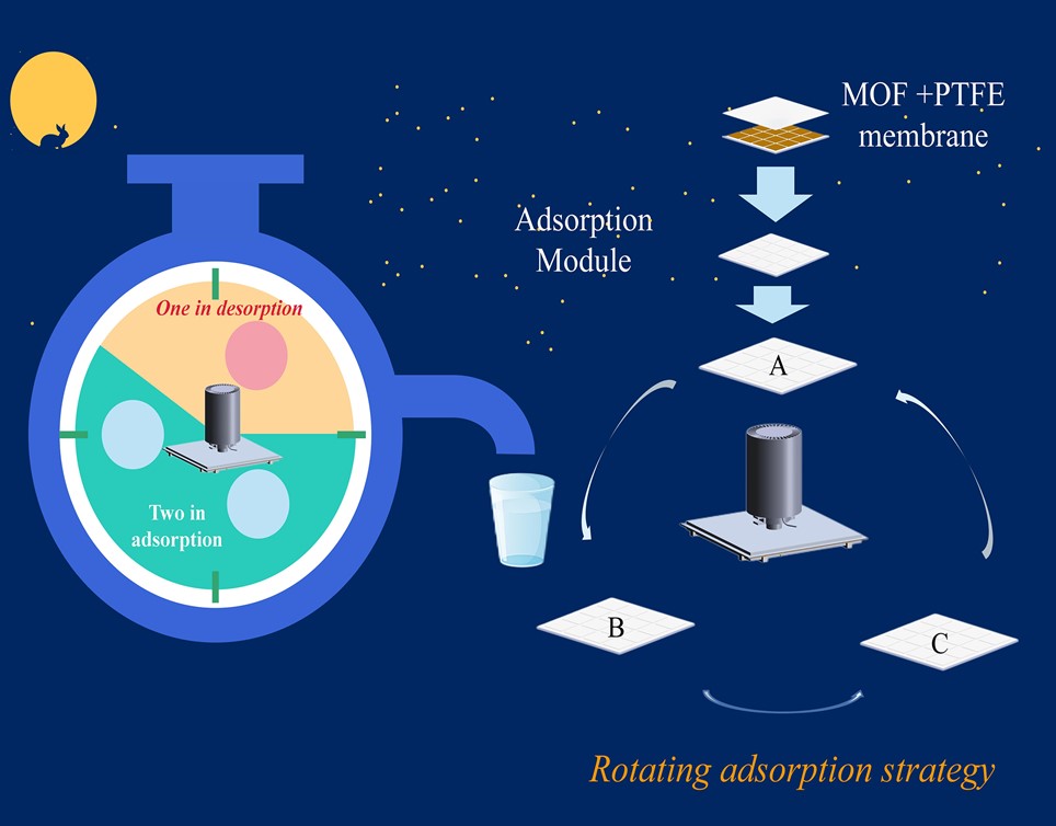 针对该材料特性合作团队开发了可适应规模化应用的封装方案并设计了全新的运行策略。不同于常规单吸附模块的设计,该策略中使用了多吸附模块以实现装置的准连续运行,而吸附模块数量经过了吸附动力学与脱附动力学的匹配,类似“轮盘”的运行策略可以同时保证装置的连续运行以及吸附剂模块的充分吸附。在该研究中,基于此设计思路及拟合结果,研究人员最终采用了三块相同的吸附模块进行策略演示并据此设计了可突破日夜限制的低温位热能驱动的空气取水装置。
