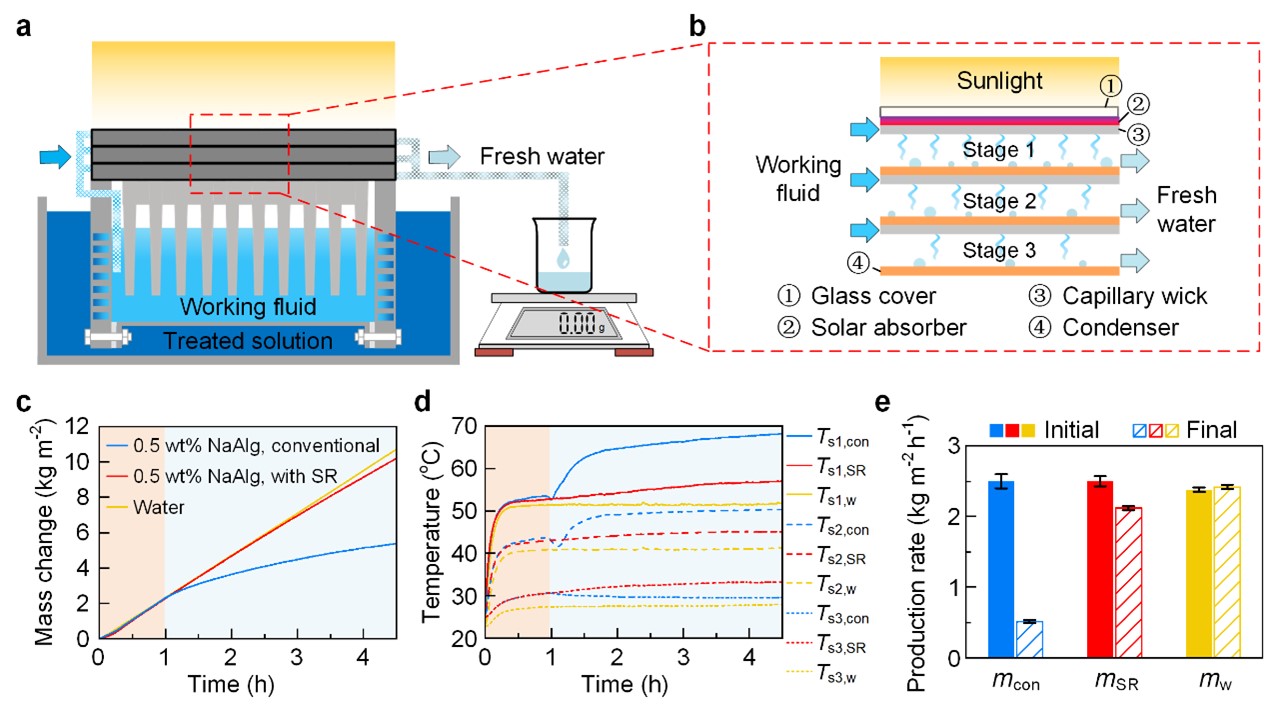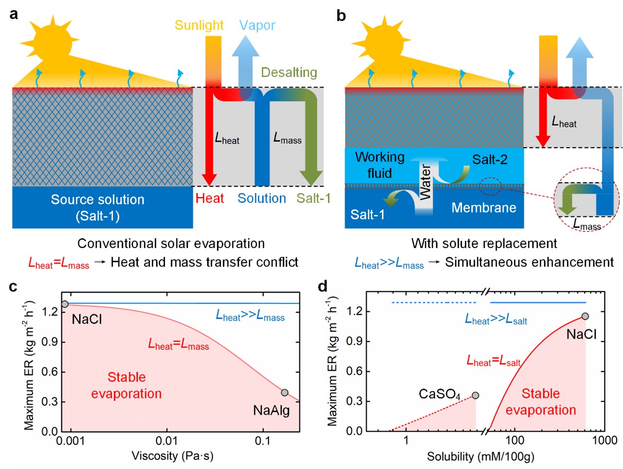 为解决上述问题,研究提出了耦合太阳能蒸发传热、毛细流动和盐分传输的理论模型,证明了溶液物性对太阳能蒸发速率的限制效应,指出高溶液粘度和低溶解度会分别在短周期和长周期运行中导致太阳能蒸发的失效。研究进一步提出了耦合太阳能蒸发与正渗透的溶质置换策略,实现了CaSO4溶液的不结垢蒸发,并在处理粘度比水高225倍的NaAlg溶液时将蒸发性能提升了478%。