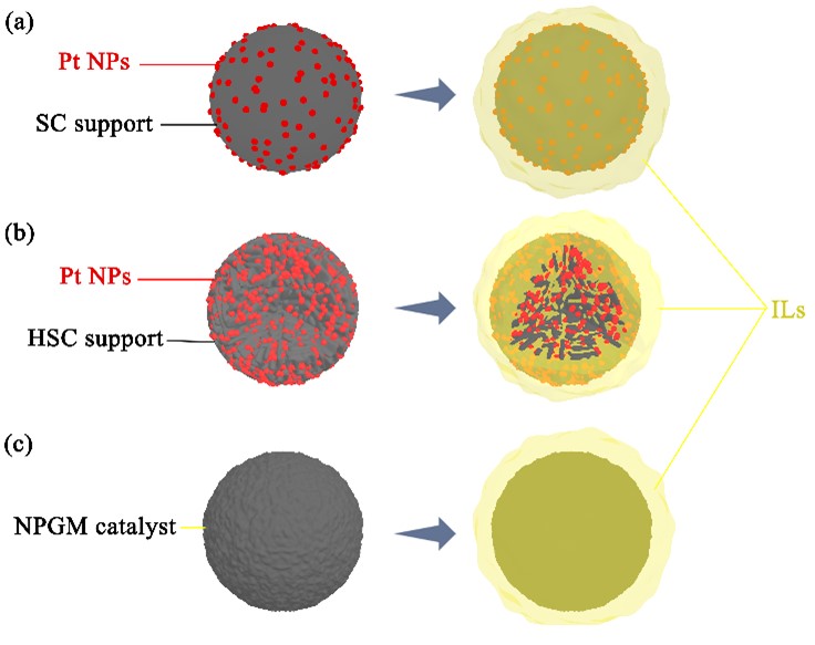图2 基于不同类型催化剂的SCILL结构示意图:(a)固体碳载铂催化剂;(b)多孔碳载铂催化剂;(c)非铂催化剂