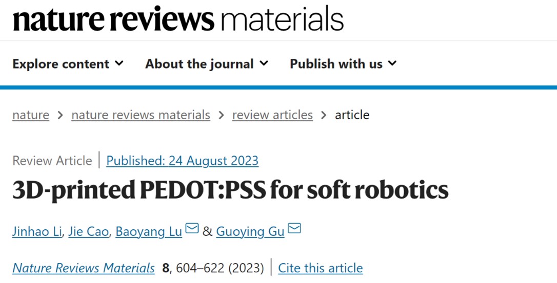 近日,beat365中文官方网站beat365中文官方网站谷国迎教授团队在Nature Reviews Materials上发表“3D-printed PEDOT:PSS for soft robotics”综述文章,针对3D打印技术制造PEDOT:PSS导电聚合物材料应用于软体机器人领域进行了系统分析与前瞻展望。上海交大beat365中文官方网站博士研究生李金昊为论文第一作者,江西科技师范大学硕士研究生曹杰为共同第一作者,谷国迎教授、江西科技师范大学卢宝阳教授为共同通讯作者。