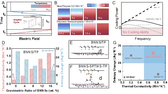 团队以该复合材料为制冷核心制备了电卡制冷器件,其中高分子复合材料在系统热沉与热源之间形成布雷顿循环。在相同材料厚度的条件下,更高的热导率能有效缩短热传递时间,进而输出更大的制冷量和COP。器件实际运行结果表明,简单地将BNNS与terpolymer掺杂虽然可以有效提高热导率,但得到的BNNS/TP电致熵变显著恶化,这再次指出了高导热率要求的结构有序性和高电致熵变要求的极性无序性之间存在矛盾。作者利用SPTMS分子限制将BNNS与弛豫铁电高分子交联,撑开了并限制了BNNS和聚合物链之间的空间,让有序结构与无序结构各司其职,同时实现了材料的大电卡熵变和高热导率。