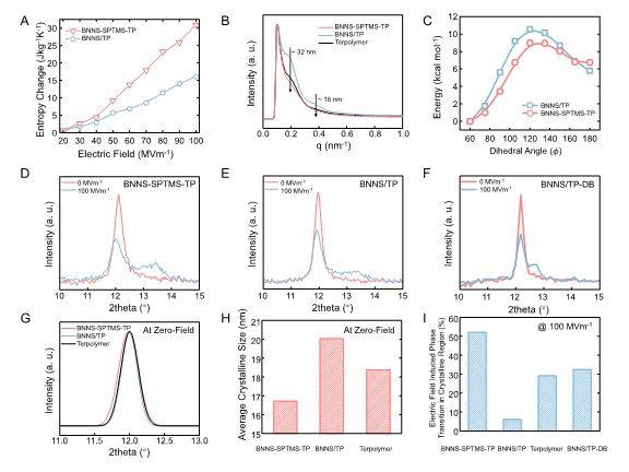 在100MV/m的电场下,terpolymer的熵变为29 J/kgK,而BNNS/TP的熵变降低至16 J/kgK,BNNS-SPTMS-TP的熵变增加至31 J/kgK。SAXS的表征结果合理解释了这一现象。BNNS/TP在32 nm和16 nm附近出现了明显的长程序峰,而BNNS-SPTMS-TP的峰值相比terpolymer更弱。DFT计算结果一方面佐证了SAXS数据,另一方面说明BNNS-SPTMS-TP的相变能垒更低。进一步地,在原位WAXD测试中发现BNNS-SPTMS-TP的相转变比例更大,结晶晶粒尺寸更小。