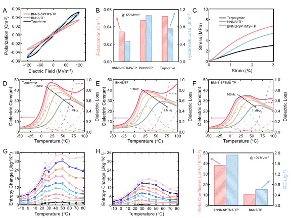 电卡(Electrocaloric,EC)制冷能够直接高效利用电能,易于实现高COP和低TEWI。EC聚合物材料凭借其柔性、自修复、低成本等优点受到学术界的广泛关注。然而,低热导率是掣肘EC聚合物应用的关键问题。在聚合物中添加高热导率纳米填料是改善其热导率的有效手段。在这项工作中,为了避免填料的EC效应对聚合物性能带来的干扰,钱小石教授团队将电学惰性的BNNS作为填料,掺杂至P(VDF-TrFE-CFE)三元共聚物(terpolymer),并通过界面调控合成了BNNS-SPTMS-TP,这种材料兼具高热导率、高熵变、宽工作温度窗口、高击穿场和高机械模量等特性,有效提高了EC制冷器件的制冷功率密度和温宽,为EC制冷器件的设计提供了便利。