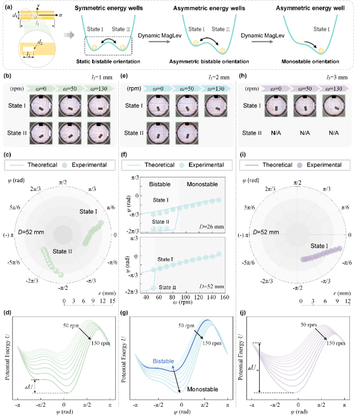动态抗磁悬浮检测方法的出发点是通过设计可调控的动态离心力来放大悬浮物内部的密度差异。理论与实验研究揭示了可调离心力、非线性磁力与内部密度异质性对物体悬浮稳态的影响规律。非线性磁力与可调离心力的设计实现了悬浮物体稳定平衡态的调节,悬浮稳态特征可用于辨识物体内密度异质性差异,如均质与具有密度梯度的材料分别呈现不同方向的单稳态悬浮定向,而具有局部缺陷的材料具有双稳态或双稳态-单稳态悬浮定向特性。利用物体的非线性悬浮特征表征内部密度异质性,为推动抗磁悬浮方法走向材料非接触、无标记、无损检测实际应用提供了新思路。