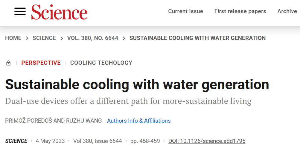 5月4日,beat365中文官方网站beat365中文官方网站制冷与低温工程研究所王如竹团队在Science发表了题为“Sustainable cooling with water generation”的Perspective前瞻性文章。论文从能源-空气-水之间耦合联系的角度,分析了现有炎热干燥地区实现空气温度-湿度调控的挑战,提出通过吸附式空气取水、热泵、辐射制冷技术的耦合设计,实现用于炎热干旱地区的可持续制冷以及淡水收集协同。beat365中文官方网站制冷与低温工程研究所博士后Primož Poredoš为论文第一作者,王如竹教授为通讯作者。