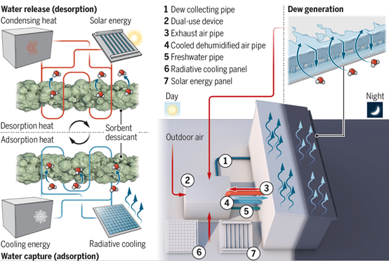 如何避免使用能量密集过程,以淡水生产作为副产品实现可持续冷却?论文提出需要拓展现有制冷和冷却技术的边界,将其与吸附式空气取水、热泵、辐射制冷等先进技术有机结合,对水分-能量热力过程进行调控,解决炎热、干旱的地区高效空调制冷以及淡水协同收集的难题,为实现全球绿色低碳转型和可持续发展提供新的途径。鉴于炎热干旱地区具有晴天和充足的阳光的气候特点,论文提出利用太阳光热-储热热能以及天空辐射制冷冷能分别协调增强吸附剂(干燥剂)解吸和吸附过程,进而为利用吸附-解吸过程中同时存在水分和能量的储存和传输效应、协调处理空气温湿度提供可能。